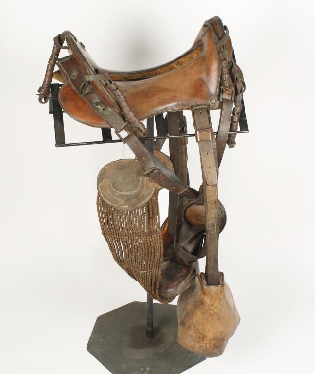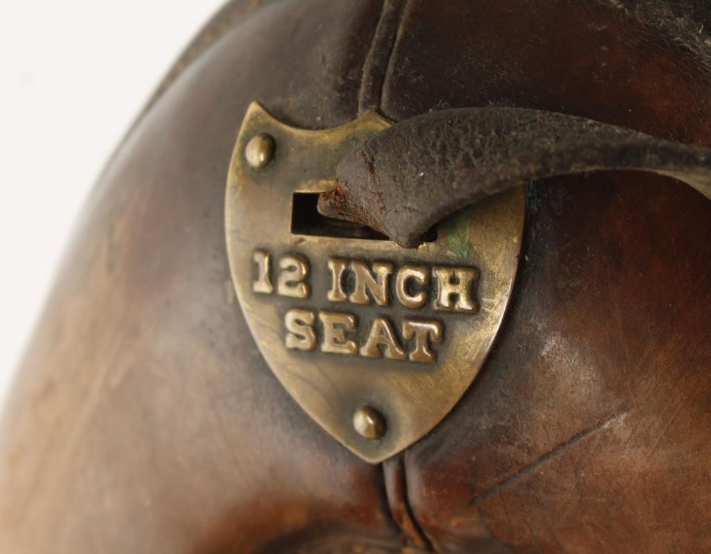 Brown leather saddle with coat straps and horse hair cinch. Shield shaped plaque marked "12 inch seat". Shows age. Stirrup guards stamped "H.J." Cinch stamped "Rock Island Arsenal 1908 TC".