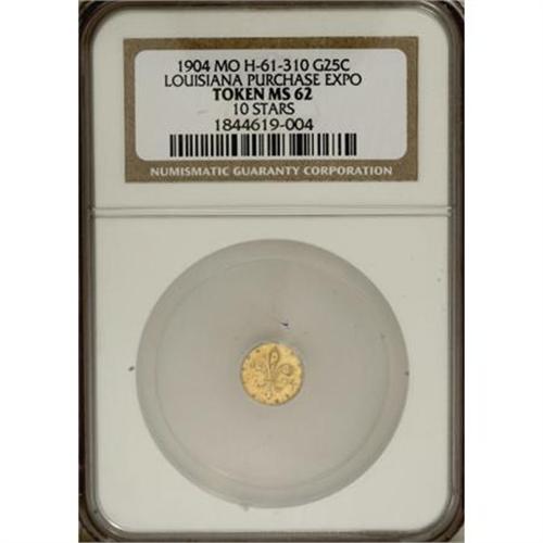 <B>1904 G25C Louisiana Purchase Expo Gold Quarter Token H-61-310. 10 Stars MS62 NGC.</B></I> <BR><BR><b>Shipping:</b> Coins & Currency (<a target="_blank" href="http://www.heritageauctions.com/common/shipping.php">view shipping information</a>)