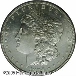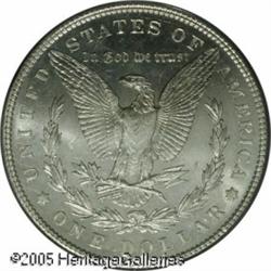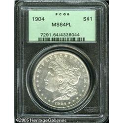 <B>1904<img border='0' src='http://www.heritagecoins.com/images/star.gif' width=10 height=10>$1 MS64 Prooflike PCGS.</B></I> The 1904 is seldom located with prooflike fields, and when encountered such coins tend to be dull and lack contrast. This piece is certainly not dull. In fact, it is bright and sparkles with prooflike reflectivity and there is even an ever-so-slight contrast on each side. Fully struck, the coin is brilliant throughout with no mentionable abrasions. Population: 10 in 64, 0 finer (1/05). Lot:10627