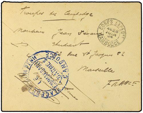 1904 Military mail envelope to FRANCE endorsed "Troupes du Cambodge" cancelled by CORPS EXPED. CAMBODGE double ring with military cachet PLACE DE PHOUM PENH CAMBODGE/LE COMMANDANT D´ARMES in blue. Very fine.