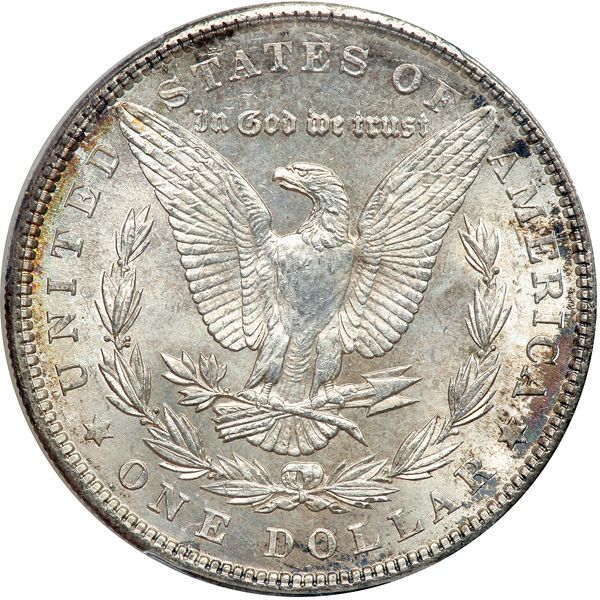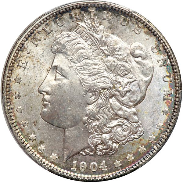 1904 Morgan Dollar. PCGS graded MS-65. Well struck with some rainbow toning. Despite its more than sufficient mintage in comparison to other P-mint dates in the early 1900s, the 1904 is well-known as a very scarce one in top-end condition like this lovely, satiny Gem MS65. Of course, the toning adds several measures more to the mix or rarity and desirability. Pop 191; 16 finer, 1 in 65+, 15 in 66 (PCGS # 7290) .