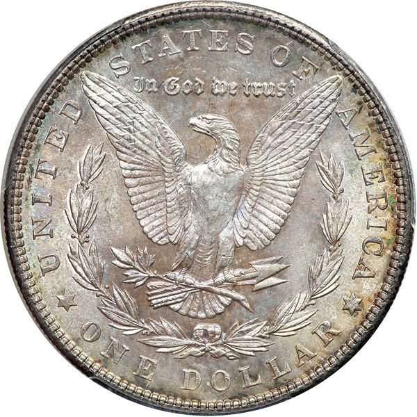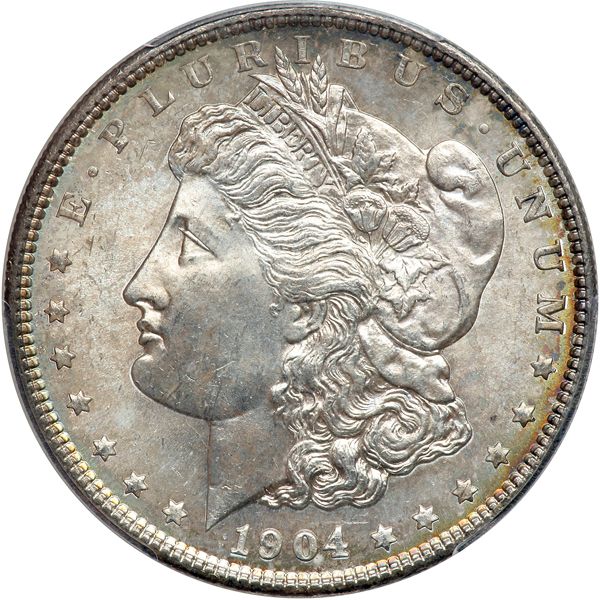1904 Morgan Dollar. PCGS graded MS-65. Light shades of blue and gold toning. A lovely coin. Pop 191; 16 finer, 1 in 65+, 15 in 66 (PCGS # 7290) .