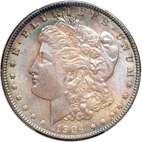 1904 Morgan Dollar. PCGS graded MS-64 PQ CAC Approved. Lovely natural violet toning from an old envelope. Another attractive example from this old-time consignment (PCGS # 7290) .