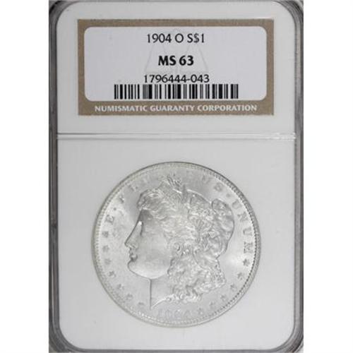 <B>1904-O $1 MS63 NGC.</B></I> VAM-13. The reverse is rotated 30 degrees counterclockwise. NGC Census: (18671/58218). PCGS Population (25105/42746). Mintage: 3,720,000. Numismedia Wsl. Price for NGC/PCGS coin in MS63: $38. (#7292)<BR><BR><B>Coin Engraver:</B> George T. Morgan<BR><BR><b>Shipping:</b> Coins & Currency (<a target="_blank" href="http://www.heritageauctions.com/common/shipping.php">view shipping information</a>)