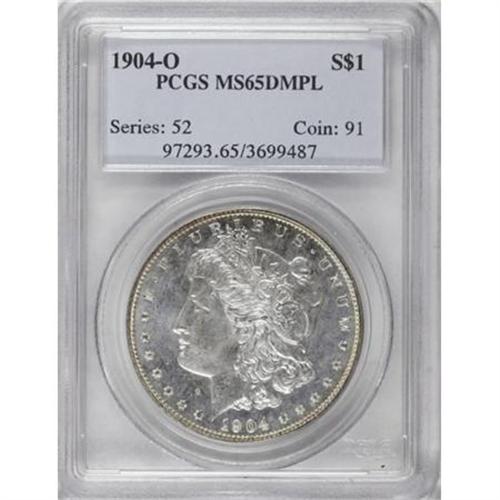 <B>1904-O $1 MS65 Deep Mirror Prooflike PCGS.</B></I> An attentive strike lends exquisite delineation to the design elements, including the hair above Liberty's hair and the eagle's breast feathers. Whispers of light gold make occasional visits to both sides, each of which exhibits a fair degree of field-motif contrast. A few grade-consistent marks are noted on the obverse.<BR><BR><b>Shipping:</b> Coins & Currency (<a target="_blank" href="http://www.heritageauctions.com/common/shipping.php">view shipping information</a>)