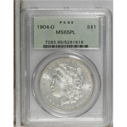 <B>1904-O $1 MS65 Prooflike PCGS.</B></I> PCGS Population (387/57). NGC Census: (367/44). Numismedia Wsl. Price for NGC/PCGS coin in MS65: $200. (#7293)<BR><BR><b>Shipping:</b> Coins & Currency (<a target="_blank" href="http://www.heritageauctions.com/common/shipping.php">view shipping information</a>)