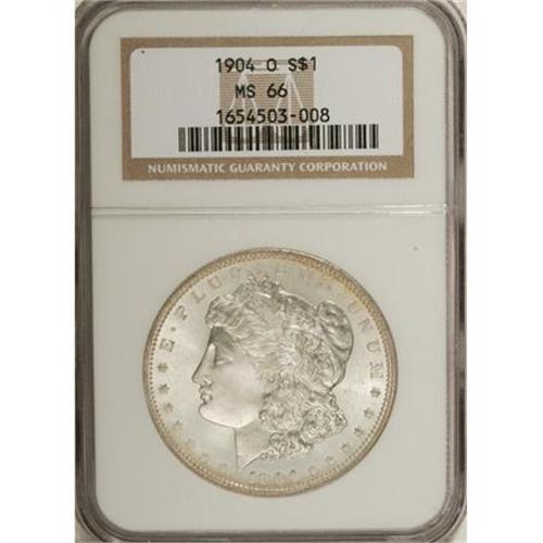 <B>1904-O $1 MS66 NGC.</B></I> NGC Census: (1056/68). PCGS Population (665/26). Mintage: 3,720,000. Numismedia Wsl. Price for NGC/PCGS coin in MS66: $352. (#7292)<BR><BR><b>Shipping:</b> Coins & Currency (<a target="_blank" href="http://www.heritageauctions.com/common/shipping.php">view shipping information</a>)