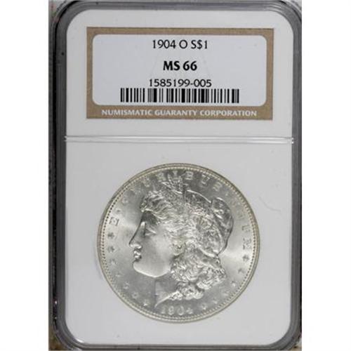 <B>1904-O $1 MS66 NGC.</B></I> NGC Census: (1086/69). PCGS Population (670/26). Mintage: 3,720,000. Numismedia Wsl. Price for NGC/PCGS coin in MS66: $352. (#7292)<BR><BR><B>Coin Engraver:</B> George T. Morgan<BR><BR><b>Shipping:</b> Coins & Currency (<a target="_blank" href="http://www.heritageauctions.com/common/shipping.php">view shipping information</a>)