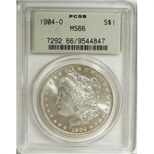 <B>1904-O $1 MS66 PCGS.</B></I> PCGS Population (669/27). NGC Census: (1090/69). Mintage: 3,720,000. Numismedia Wsl. Price for NGC/PCGS coin in MS66: $352. (#7292)<BR><BR><B>Coin Engraver:</B> George T. Morgan<BR><BR><b>Shipping:</b> Coins & Currency (<a target="_blank" href="http://www.heritageauctions.com/common/shipping.php">view shipping information</a>)