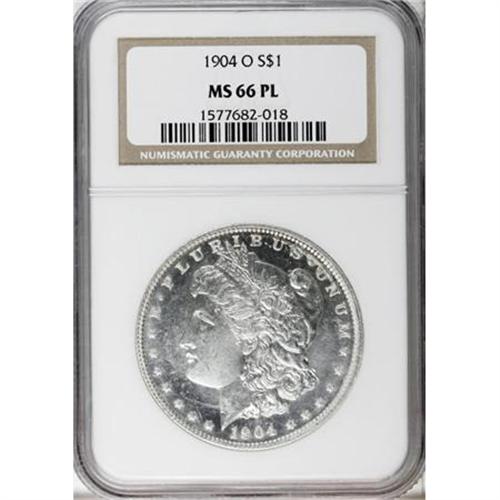<B>1904-O $1 MS66 Prooflike NGC.</B></I> Prooflike example of this issue are extremely scarce at the Premium Gem level, and a mere two pieces are currently graded finer in Prooflike condition (1/08). This piece is sharply struck with highly reflective surfaces and few marks on either side. Some cloudiness and a few wispy die polish lines are noted in the fields. <BR><BR><B>Coin Engraver:</B> George T. Morgan<BR><BR><b>Shipping:</b> Coins & Currency (<a target="_blank" href="http://www.heritageauctions.com/common/shipping.php">view shipping information</a>)