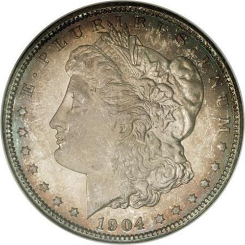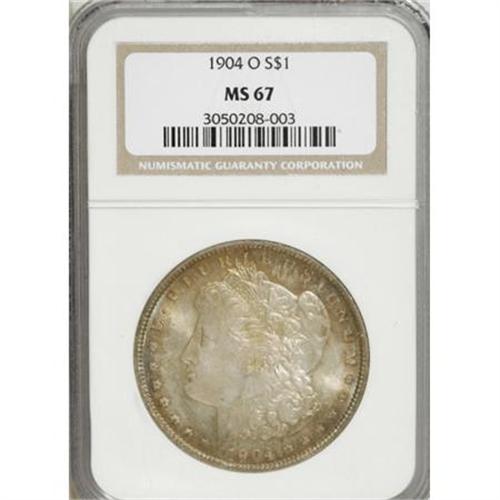 <B>1904-O $1 MS67 NGC.</B></I> Although Mint State 1904-O Morgan dollars are not rare, the population thins at MS66 and at MS67 these coins are legitimately scarce. PCGS has graded only 27 examples at this level, with no examples finer (11/07). The presently offered example has a uniform layer of toning with Champagne, rose, and sparkling blue hues. The strike is more than adequate the surfaces are nearly devoid of marks. Rich luster smolders beneath the patina. <BR><BR><B>Coin Engraver:</B> George T. Morgan<BR><BR><b>Shipping:</b> Coins & Currency (<a target="_blank" href="http://www.heritageauctions.com/common/shipping.php">view shipping information</a>)