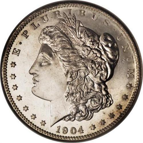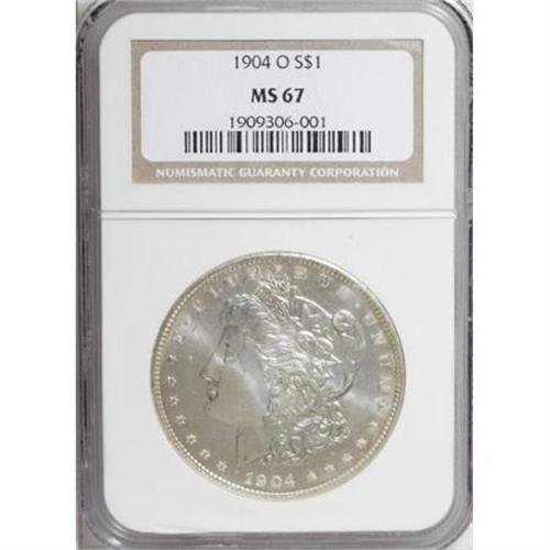 <B>1904-O $1 MS67 NGC.</B></I> An amazing survivor from the last of the O-mint Morgan dollars, exquisitely detailed on all design elements. The fields are surprisingly reflective, though not so much as to warrant a Prooflike designation, with subtle silver-blue and cloud-gray elements that cede to gold-orange at the rims. Neither NGC nor PCGS has graded a numerically finer example (3/08).<BR><BR><B>Coin Engraver:</B> George T. Morgan<BR><BR><b>Shipping:</b> Coins & Currency (<a target="_blank" href="http://www.heritageauctions.com/common/shipping.php">view shipping information</a>)