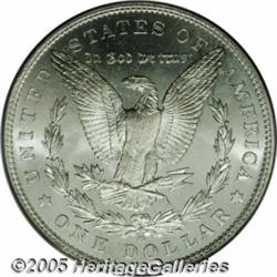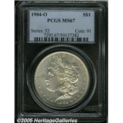 <B>1904-O<img border='0' src='http://www.heritagecoins.com/images/star.gif' width=10 height=10>$1 MS67 PCGS.</B></I> Incredible quality 1904-O Morgan Silver Dollar, tied for finest certified by PCGS. This issue is seldom encountered in Superb quality, despite its status as one of the five most common Morgan Dollar issues. The satiny surfaces are fully brilliant and lustrous with only a trace of toning. The fields, especially on the reverse, are slightly prooflike. Population: 25 in 67, 0 finer (2/05).