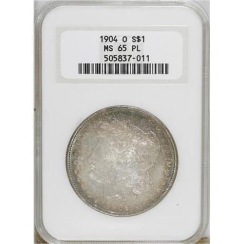 <B>1904-O $1 MS65 Prooflike NGC.</B></I> . NGC Census: (370/48). PCGS Population (394/56). Numismedia Wsl. Price for NGC/PCGS coin in MS65: $215. (#7293)<BR><BR><B>Coin Engraver:</B> George T. Morgan<BR><BR><b>Shipping:</b> Coins & Currency (<a target="_blank" href="http://www.heritageauctions.com/common/shipping.php">view shipping information</a>)
