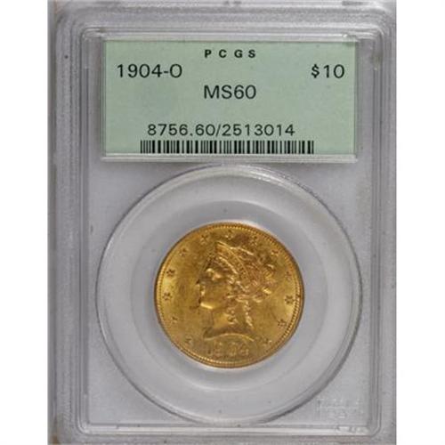 <B>1904-O $10 MS60 PCGS.</B></I> PCGS Population (58/309). NGC Census: (46/303). Mintage: 108,950. Numismedia Wsl. Price for NGC/PCGS coin in MS60: $365. (#8756)<BR><BR><B>Coin Engraver:</B> Christian Gobrecht<BR><BR><b>Shipping:</b> Coins & Currency (<a target="_blank" href="http://www.heritageauctions.com/common/shipping.php">view shipping information</a>)