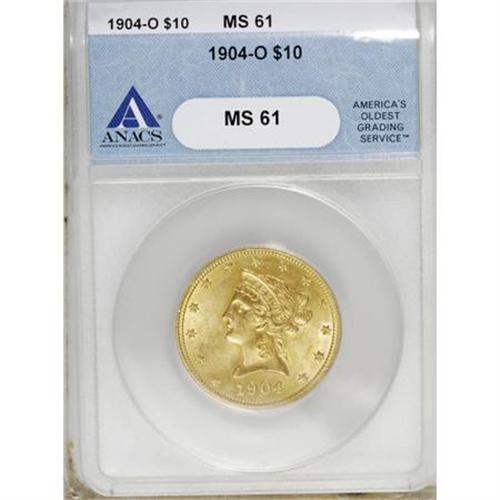 <B>1904-O $10 MS61 ANACS.</B></I> NGC Census: (139/167). PCGS Population (94/218). Mintage: 108,950. Numismedia Wsl. Price for NGC/PCGS coin in MS61: $375. (#8756)<BR><BR><B>Coin Engraver:</B> Christian Gobrecht<BR><BR><b>Shipping:</b> Coins & Currency (<a target="_blank" href="http://www.heritageauctions.com/common/shipping.php">view shipping information</a>)