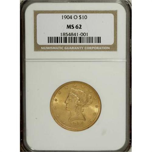 <B>1904-O $10 MS62 NGC.</B></I> NGC Census: (122/45). PCGS Population (142/67). Mintage: 108,950. Numismedia Wsl. Price for NGC/PCGS coin in MS62: $700. (#8756)<BR><BR><B>Coin Engraver:</B> Christian Gobrecht<BR><BR><b>Shipping:</b> Coins & Currency (<a target="_blank" href="http://www.heritageauctions.com/common/shipping.php">view shipping information</a>\)