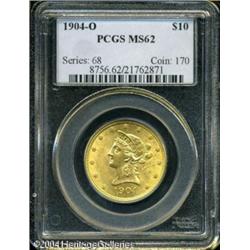 1904-O $10 MS62 PCGS. Crisply struck, the cartwhee <B>1904-O $10 MS62 PCGS.</B></I> Crisply struck, the cartwheel luster is unbroken and contact marks are few in number. A series of minor planchet flaws (as made) are on the left reverse field. Like all Motto Liberty Tens, a low mintage issue that is scarce in better Mint State grades. <BR><BR><B>Important notice:</B> Heritage usually auctions material at the rate of 200-250 lots per hour. On some occasions eBay Live bid software or the Internet may not be able to keep up with the pace of the auction. We recommend placing a realistic absentee bid now as insurance to avoid disappointment. Occasionally the auctioneer may eliminate or reject an eBay Live bid, and the auctioneer may also reopen a lot after the close of the eBay live bidding (usually because we missed an audience bid), and may reject your bid even if it shows you as the winning bidder. By bidding via eBay Live, you agree that Heritage may award the lot to another bidder at its sole discretion under the circumstances described above or any other reasonable circumstances. Since eBay bids are not shown to us until we open the lot on the floor, we treat those bids just like floor bids. In most cases the floor responds before the eBay bid is presented to us, due to Internet lag time, so for consistency we have made it a policy that floor bids are always considered first over tie eBay live bids. Also please note that all Heritage lots purchased through eBay Live carry a 20% Buyer's Premium. Please make sure you read the Terms and Conditions before you bid. This lot is being auctioned in conjunction with a live floor auction by Heritage Galleries & Auctioneers. All final auction and invoice information will be supplied by Heritage Galleries & Auctioneers, and all other information should be considered preliminary. Lot:6788