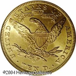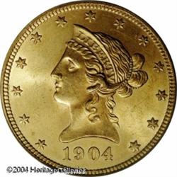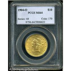 1904-O $10 MS64 PCGS. This magnificent New Orleans <B>1904-O $10 MS64 PCGS.</B></I> This magnificent New Orleans Eagle has unencumbered luster and is needle-sharp aside from the centrils of the final star. No bagmarks are present, and only the faintest slide marks deny classification as a full Gem. Specialists of the mint and type know the difficulty of obtaining lustrous and clean examples, and should take advantage of the present opportunity. Population: 11 in 64, 5 finer (10/04). <BR><BR><B>Important notice:</B> Heritage usually auctions material at the rate of 200-250 lots per hour. On some occasions eBay Live bid software or the Internet may not be able to keep up with the pace of the auction. We recommend placing a realistic absentee bid now as insurance to avoid disappointment. Occasionally the auctioneer may eliminate or reject an eBay Live bid, and the auctioneer may also reopen a lot after the close of the eBay live bidding (usually because we missed an audience bid), and may reject your bid even if it shows you as the winning bidder. By bidding via eBay Live, you agree that Heritage may award the lot to another bidder at its sole discretion under the circumstances described above or any other reasonable circumstances. Since eBay bids are not shown to us until we open the lot on the floor, we treat those bids just like floor bids. In most cases the floor responds before the eBay bid is presented to us, due to Internet lag time, so for consistency we have made it a policy that floor bids are always considered first over tie eBay live bids. Also please note that all Heritage lots purchased through eBay Live carry a 20% Buyer's Premium. Please make sure you read the Terms and Conditions before you bid. This lot is being auctioned in conjunction with a live floor auction by Heritage Galleries & Auctioneers. All final auction and invoice information will be supplied by Heritage Galleries & Auctioneers, and all other information should be considered preliminary. Lot:6789