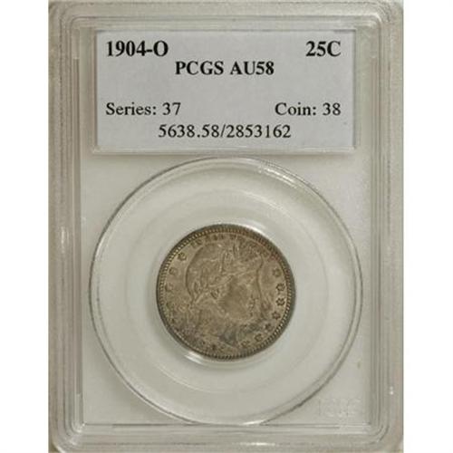 <B>1904-O 25C AU58 PCGS.</B></I> PCGS Population (5/64). NGC Census: (12/55). Mintage: 2,456,000. Numismedia Wsl. Price for NGC/PCGS coin in AU58: $450. (#5638)<BR><BR><B>Coin Engraver:</B> Charles E. Barber<BR><BR><b>Shipping:</b> Coins & Currency (<a target="_blank" href="http://www.heritageauctions.com/common/shipping.php">view shipping information</a>\)