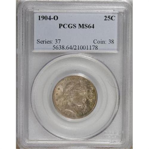 <B>1904-O 25C MS64 PCGS.</B></I> Waves of olive and sea-green toning grace the lustrous surfaces, and the devices are well-defined save for softness at the upper right corner of the shield and the eagle's claw. A diagonal planchet streak traverses Liberty's cheek and ear. A pleasing example of this 20th century New Orleans issue. Population: 17 in 64, 29 finer (5/07).<BR><BR><b>Shipping:</b> Coins & Currency (<a target="_blank" href="http://www.heritageauctions.com/common/shipping.php">view shipping information</a>)