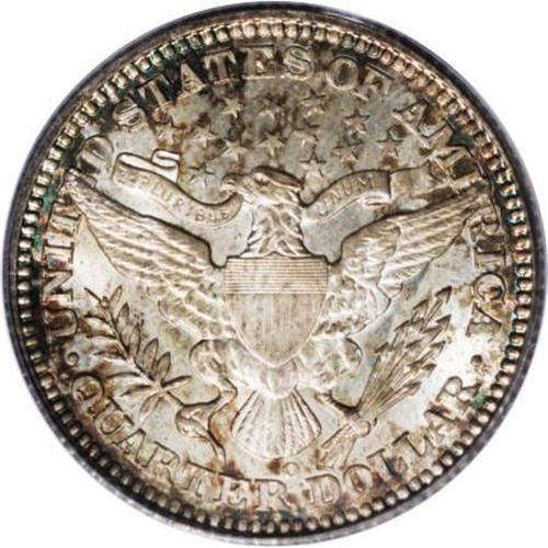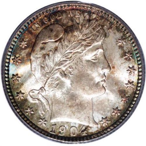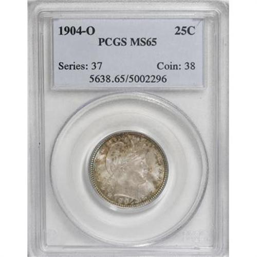 <B>1904-O 25C MS65 PCGS.</B></I> Dappled autumn-brown and ice-blue toning prevails, although the margins offer aquamarine and salmon-pink shades. A sharply struck and lustrous Gem with an exceptionally smooth reverse. Magnification locates only minor contact on the portrait. Population: 15 in 65, 14 finer (4/07).<BR><I>From The Belle Glade Collection, Part Two.</B></I><BR><BR><B>Coin Engraver:</B> Charles E. Barber<BR><BR><b>Shipping:</b> Coins & Currency (<a target="_blank" href="http://www.heritageauctions.com/common/shipping.php">view shipping information</a>\)