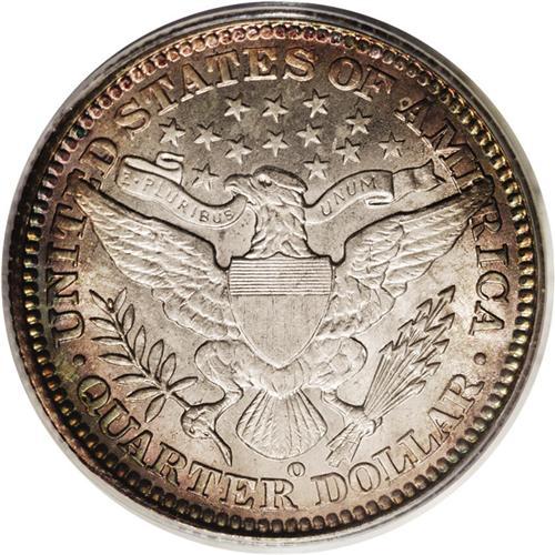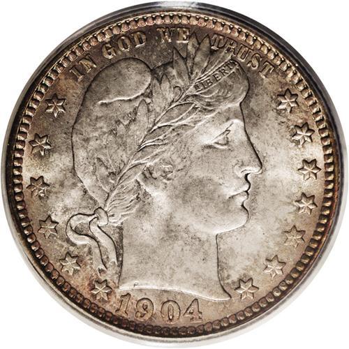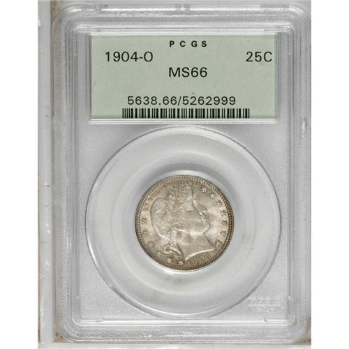 <B>1904-O<25C> MS66 PCGS.</B></I> Splashes of almond-brown and gunmetal-blue grace the centers, while forest-green toning clings to the reverse periphery. This lustrous and attractively preserved Premium Gem is encapsulated in a green label holder. The 1904-O is much more scarce in Mint State than implied by its mintage of nearly 2.5 million pieces. Population: 10 in 66, 3 finer (8/06).