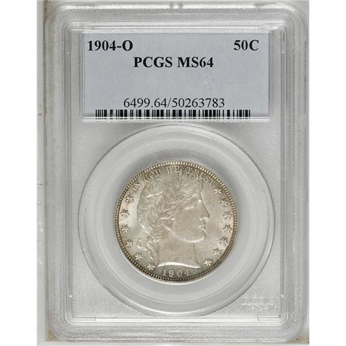 <B>1904-O<50C> MS64 PCGS.</B></I> Well struck for this strike-sensitive New Orleans issue, with hints of speckled russet toning at the margins, particularly on the reverse. Wispy contact marks on the portrait are the only grade-limiting factor. A challenging O-mint half in better Mint State grades. Population: 14 in 64, 10 finer (7/06).