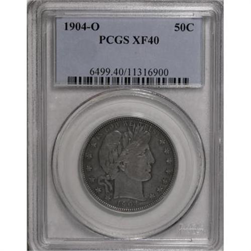 <B>1904-O 50C XF40 PCGS.</B></I> The fields remain luminous despite even wear across the devices and deep silver-gray patina that drapes the surfaces. Occasional blue and violet overtones are present near the portrait. A pleasing example of this challenging issue. Population: 2 in 40, 55 finer (3/08).<BR><BR><B>Coin Engraver:</B> Charles E. Barber<BR><BR><b>Shipping:</b> Coins & Currency (<a target="_blank" href="http://www.heritageauctions.com/common/shipping.php">view shipping information</a>)