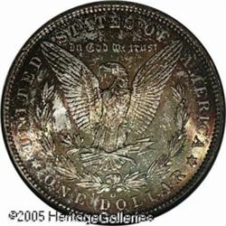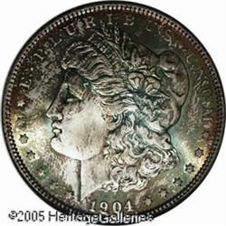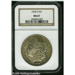 <B>1904-O<img border='0' src='http://www.heritagecoins.com/images/star.gif' width=10 height=10>$1 MS67 NGC.</B></I> We cannot remember the last time we saw a 1904-O dollar with this degree of toning. It has the depth and intensity of color that coins take on after many years in a 2x2 paper envelope. One can speculate all day, but never really know for certain, was this a pre-1962 Treasury release coin that was housed in such an envelope when only a handful of Uncirculated 1904-O dollars were known? Only one mark is of any consequence, that being located on the highpoint of Liberty's cheek, and it is very well concealed by the depth of gray patina over the face of Liberty. Elsewhere the surfaces display moss-green and rose coloration with strong underlying mint luster. Population: 34 in 67, 0 finer (1/05). Lot:10631