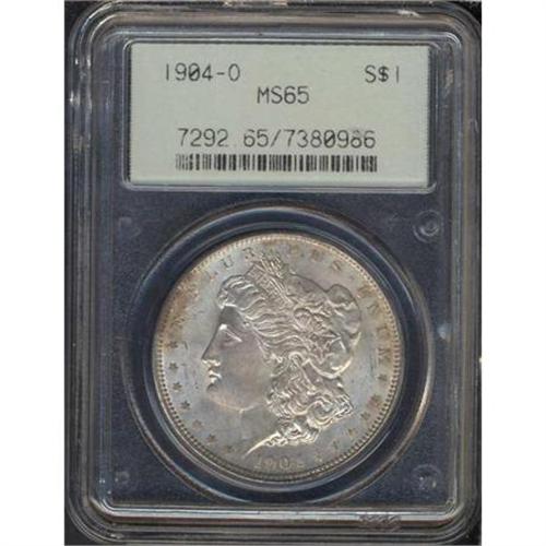 <b>1904-O Morgan Dollar. PCGS graded MS65.</b> Toned. Mint luster like glinting frosted glass gives this coin much of its life and MS65 originality <b>(PCGS # 7292)</b>