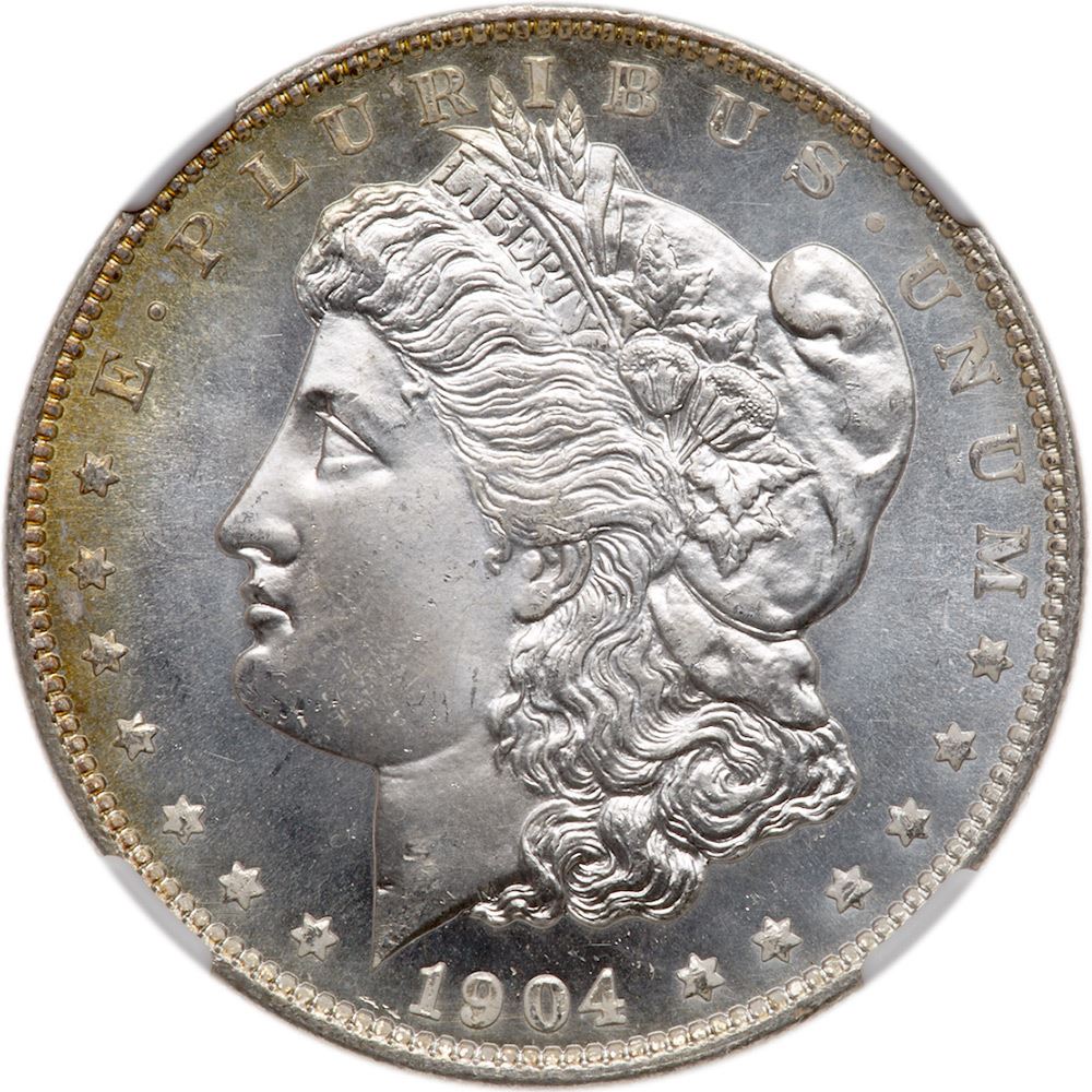 1904-O. NGC graded MS-67+ Prooflike. PQ. Sure looks better than the given grade as the surfaces are super clean with virtualy no bagmarks. Bright white overall with just a thin arc of gold on the upper left obverse. The fields are reflective, enough to earn the rarely seen Prooflike designation, and even more incredible is the combination with this fantastic degree of quality. The best we have seen. Pop 1; the finest MSPL example graded at both services. PCGS # 7293 Estimated Value 10,000 - UP
