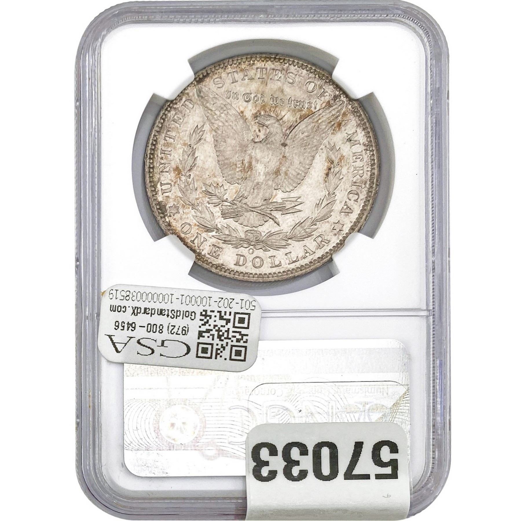 COINS AND CURRENCY LISTED IN GSA’S CATALOG AS GRADED AND ENCAPSULATED BY PCGS, NGC, ANACS, ICG, PCGS CURRENCY, PMG, PCGS BANKNOTE GRADING, CMC OR ANY OTHER THIRD-PARTY GRADING SERVICE ARE LIKEWISE SOLD “AS-IS” EXCEPT AS EXPRESSLY SET FORTH HEREIN. ALL THIRD-PARTY GRADING SERVICE GUARANTEES, INCLUDING AUTHENTICITY, ARE THE SOLE RESPONSIBILITY OF THE THIRD-PARTY GRADING SERVICE AND NOT WARRANTIES OR GUARANTEES OF GSA. BIDDERS SHOULD CONTACT THESE THIRD-PARTY GRADING SERVICES DIRECTLY WITH RESPECT TO ANY CLAIMS OR QUESTIONS THEY MAY HAVE CONCERNING THEIR GUARANTEES AND WARRANTIES. BIDDERS ACKNOWLEDGE AND AGREE THAT AUCTIONEER IS NOT BOUND BY OR LIABLE FOR ANY OPINION OR CERTIFICATION BY ANY THIRD-PARTY GRADING SERVICE. REMOVAL OF A PRODUCT FROM ITS PROTECTIVE CASING OR HOLDER OR ALTERATION OF ANY COIN HOLDER WAIVES ALL RIGHTS CONCERNING THE PRODUCT CONTAINED THEREIN.