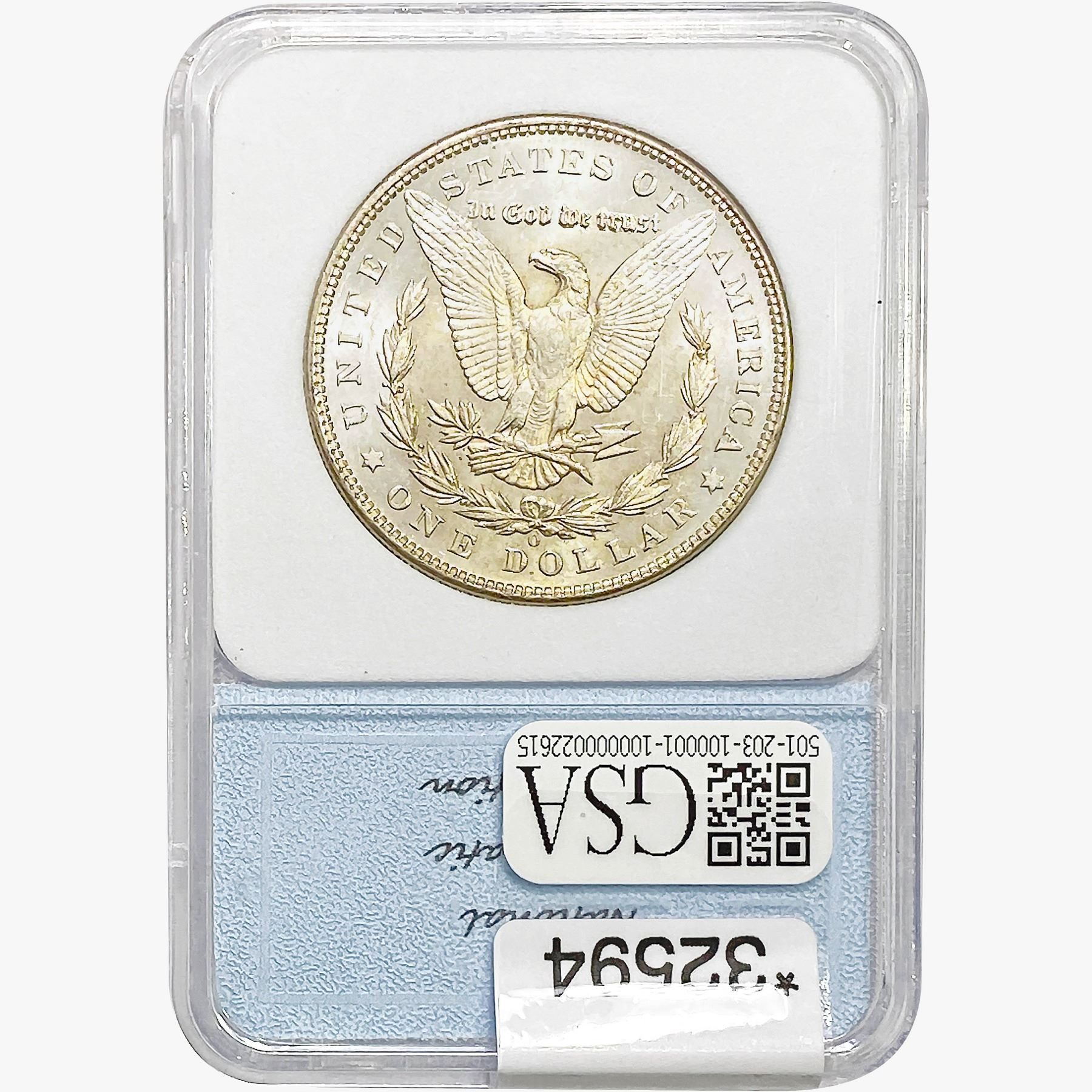COINS AND CURRENCY LISTED IN GSA’S CATALOG AS GRADED AND ENCAPSULATED BY PCGS, NGC, ANACS, ICG, PCGS CURRENCY, PMG, PCGS BANKNOTE GRADING, CMC OR ANY OTHER THIRD-PARTY GRADING SERVICE ARE LIKEWISE SOLD “AS-IS” EXCEPT AS EXPRESSLY SET FORTH HEREIN. ALL THIRD-PARTY GRADING SERVICE GUARANTEES, INCLUDING AUTHENTICITY, ARE THE SOLE RESPONSIBILITY OF THE THIRD-PARTY GRADING SERVICE AND NOT WARRANTIES OR GUARANTEES OF GSA. BIDDERS SHOULD CONTACT THESE THIRD-PARTY GRADING SERVICES DIRECTLY WITH RESPECT TO ANY CLAIMS OR QUESTIONS THEY MAY HAVE CONCERNING THEIR GUARANTEES AND WARRANTIES. BIDDERS ACKNOWLEDGE AND AGREE THAT AUCTIONEER IS NOT BOUND BY OR LIABLE FOR ANY OPINION OR CERTIFICATION BY ANY THIRD-PARTY GRADING SERVICE. REMOVAL OF A PRODUCT FROM ITS PROTECTIVE CASING OR HOLDER OR ALTERATION OF ANY COIN HOLDER WAIVES ALL RIGHTS CONCERNING THE PRODUCT CONTAINED THEREIN.