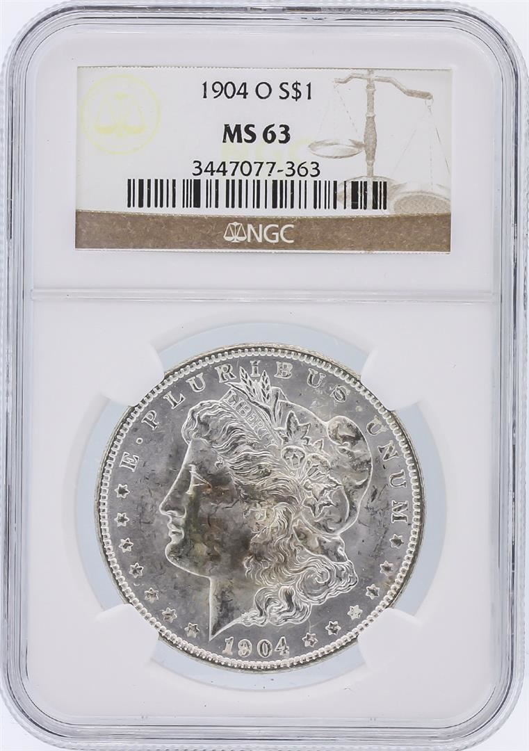 One 1904-O NGC MS63 Morgan Silver Dollar.