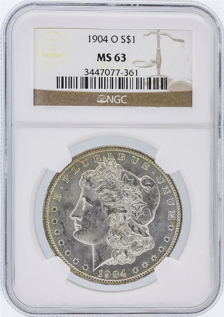 One 1904-O NGC MS63 Morgan Silver Dollar.