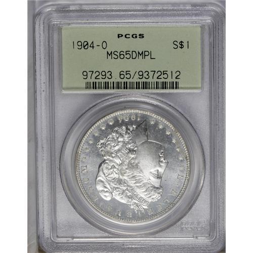 <B>1904-O<img border='0' src='http://www.heritagecoins.com/images/star.gif' width=10 height=10>$1> MS65 Deep Mirror Prooflike PCGS.</B></I> Lightly frosted devices contrast with flashy mirror fields. The obverse is unusually well preserved. Crisply struck, except for softness in the hair over Liberty's ear. Certified in a green label holder.
