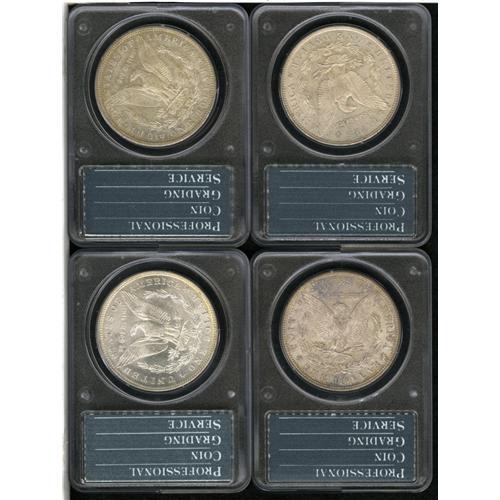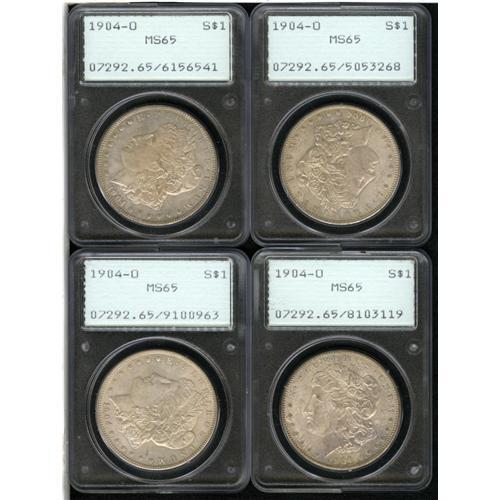 <B>1904-O<img border='0' src='http://www.heritagecoins.com/images/star.gif' width=10 height=10>$1> MS65 PCGS,</B></I> even amber-gray toning on both sides; <B>1904-O MS65 PCGS,</B></I> lustrous amber patina; <B>1904-O MS65 PCGS,</B></I> lustrous bluish-silver with amber rims on both sides; and a fourth, <B>1904-O MS65 PCGS,</B></I> silver-gold obverse and brilliant reverse. All minimally abraded and typically struck, certified in first generation PCGS holders. <BR><BR><B>Important notice:</B> Heritage usually auctions material at the rate of 200-250 lots per hour. On some occasions eBay Live bid software or the Internet may not be able to keep up with the pace of the auction. We recommend placing a realistic absentee bid now as insurance to avoid disappointment. Occasionally the auctioneer may eliminate or reject an eBay Live bid, and the auctioneer may also reopen a lot after the close of the eBay live bidding (usually because we missed an audience bid), and may reject your bid even if it shows you as the winning bidder. By bidding via eBay Live, you agree that Heritage may award the lot to another bidder at its sole discretion under the circumstances described above or any other reasonable circumstances. Since eBay bids are not shown to us until we open the lot on the floor, we treat those bids just like floor bids. In most cases the floor responds before the eBay bid is presented to us, due to Internet lag time, so for consistency we have made it a policy that floor bids are always considered first over tie eBay live bids. Also please note that all Heritage lots purchased through eBay Live carry a 20% Buyer's Premium. Please make sure you read the Terms and Conditions before you bid. This lot is being auctioned in conjunction with a live floor auction by Heritage Galleries & Auctioneers. All final auction and invoice information will be supplied by Heritage Galleries & Auctioneers, and all other information should be considered preliminary. Lot:3785 <BR><BR><B>Winning Notification and Billing:</B> After the FINAL session in this auction is complete, Heritage will send e-mail and snail mail invoices. This process normally takes several days. All final auction and invoice information will be supplied by Heritage Galleries & Auctioneers, and all other information should be considered preliminary. <BR><BR>This auction will be conducted on a live auction floor and over the Internet through eBay Live. If you choose to place an absentee bid, please take a moment to <font color='#0000ff'><u><a href='http://pages.ebay.com/liveauctions/help/before/laabsentee.html'>learn how eBay Live absentee bidding works</a></u></font><font color='#000000'>