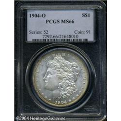 1904-O S$1 MS66 PCGS. The reverse is spectacularly <B>1904-O S$1 MS66 PCGS.</B></I> The reverse is spectacularly toned in sea-green, honey-gold, mauve, and rose-red colors, while the obverse is comparatively untoned although the border offers peach patina. The cheek and the reverse are exceptionally clean, and only the absence of a needle-sharp strike limits the grade. <BR><BR><B>Important notice:</B> Heritage usually auctions material at the rate of 200-250 lots per hour. On some occasions eBay Live bid software or the Internet may not be able to keep up with the pace of the auction. We recommend placing a realistic absentee bid now as insurance to avoid disappointment. Occasionally the auctioneer may eliminate or reject an eBay Live bid, and the auctioneer may also reopen a lot after the close of the eBay live bidding (usually because we missed an audience bid), and may reject your bid even if it shows you as the winning bidder. By bidding via eBay Live, you agree that Heritage may award the lot to another bidder at its sole discretion under the circumstances described above or any other reasonable circumstances. Since eBay bids are not shown to us until we open the lot on the floor, we treat those bids just like floor bids. In most cases the floor responds before the eBay bid is presented to us, due to Internet lag time, so for consistency we have made it a policy that floor bids are always considered first over tie eBay live bids. Also please note that all Heritage lots purchased through eBay Live carry a 20% Buyer's Premium. Please make sure you read the Terms and Conditions before you bid. This lot is being auctioned in conjunction with a live floor auction by Heritage Galleries & Auctioneers. All final auction and invoice information will be supplied by Heritage Galleries & Auctioneers, and all other information should be considered preliminary. Lot:7747