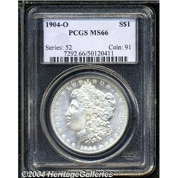 <B>1904-O<S$1> MS66 PCGS.</B></I> Semi-prooflike, this MS66 silver dollar is essentially untoned, shows only a few luster grazes, and exhibits crisp detail on all the central and peripheral devices. <BR><BR><B>Important notice:</B> Heritage usually auctions material at the rate of 200-250 lots per hour. On some occasions eBay Live bid software or the Internet may not be able to keep up with the pace of the auction. We recommend placing a realistic absentee bid now as insurance to avoid disappointment. Occasionally the auctioneer may eliminate or reject an eBay Live bid, and the auctioneer may also reopen a lot after the close of the eBay live bidding (usually because we missed an audience bid), and may reject your bid even if it shows you as the winning bidder. By bidding via eBay Live, you agree that Heritage may award the lot to another bidder at its sole discretion under the circumstances described above or any other reasonable circumstances. Since eBay bids are not shown to us until we open the lot on the floor, we treat those bids just like floor bids. In most cases the floor responds before the eBay bid is presented to us, due to Internet lag time, so for consistency we have made it a policy that floor bids are always considered first over tie eBay live bids. Also please note that all Heritage lots purchased through eBay Live carry a 20% Buyer's Premium. Please make sure you read the Terms and Conditions before you bid. </span></font></tr></table></td></tr></table>