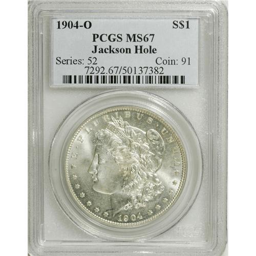 <B>1904-O S$1 MS67 PCGS.</B></I> Ex: Jackson Hole. This is an incredible 1904-O Morgan silver dollar, tied for finest certified by PCGS. This issue is seldom encountered in Superb quality, despite its status as one of the five most common Morgan dollar issues. The satiny surfaces are fully brilliant and lustrous with only a trace of milky patina on each side. The fields, especially on the reverse, are slightly prooflike. Population: 26 in 67, 0 finer (2/07).<BR><I>From The Jackson Hole Collection.</B></I><BR><BR><b>Shipping:</b> Coins & Currency (<a target="_blank" href="http://www.heritageauctions.com/common/shipping.php">view shipping information</a>)