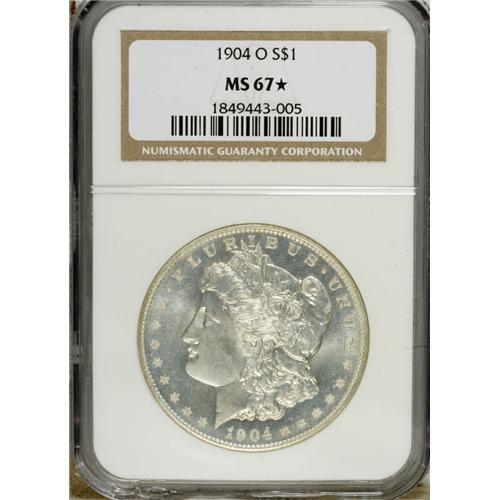 <B>1904-O S$1 MS67 <img border='0' src='http://www.heritagecoins.com/images/star.gif' width=10 height=10> NGC.</B></I> This is an intriguing coin with sharp central obverse and reverse details, but considerable weakness near the borders. For example, the hair over Liberty's ear is fully defined but the date and all of the stars on the obverse are nearly flat. The fields on both sides are entirely prooflike and the devices are satiny. Both sides are entirely brilliant with no trace of toning.<BR><BR><b>Shipping:</b> Coins & Currency (<a target="_blank" href="http://www.heritageauctions.com/common/shipping.php">view shipping information</a>)