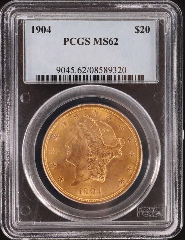 1904 P Gold Liberty Head Double Eagle $20 PCGS Mint State-62 coin 90% gold.