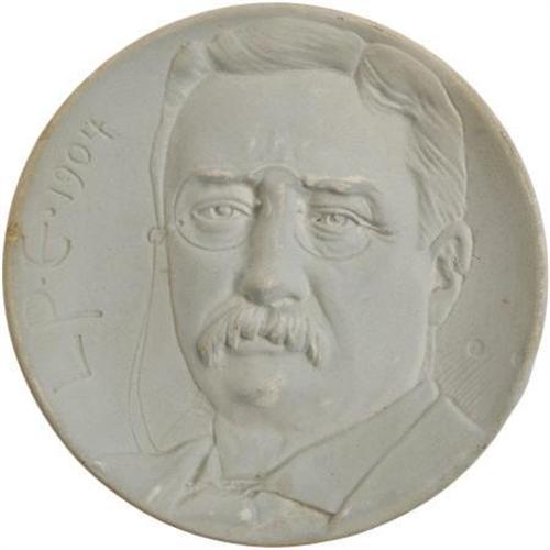 <B>1904 Presidential Candidate Theodore Roosevelt Portrait Plate,</B></I> 4.75" in diameter, the plate pictures Roosevelt with the date 1904 and the artist's initials (L.P.E.). The reverse is marked WELLER. The plates were sold at the St. Louis World's Fair. The popularity of incumbent Theodore Roosevelt led to his landslide victory. Light surface wear and two small chips else fine. <BR><BR><b>Shipping:</b> Hollowware/Pottery/Glass, Small (<a target="_blank" href="http://www.heritageauctions.com/common/shipping.php">view shipping information</a>)