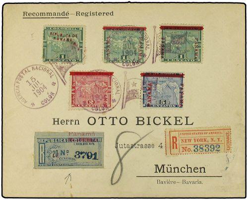 1904 Registered envelope to Munich franked 1c. map of 1903; 1c., 2c. & 5c. overprinted "up & down Panama" + 1c. ´Panama´ both reading down, together with Registration 20c. blue/blue – all tied by Colon "Flag" cancel. Obverse also bears New York registration etiquette.