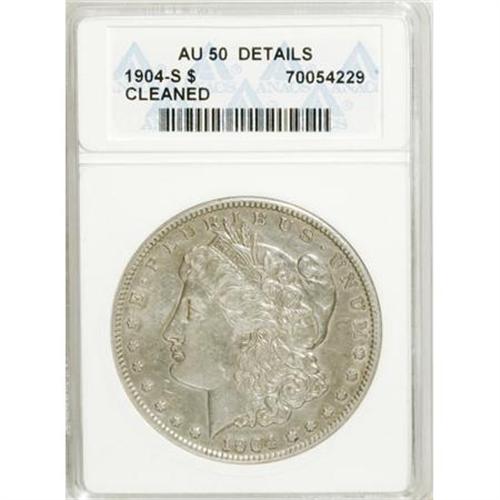 <B>1904-S $1 --Cleaned--ANACS. AU50 Details.</B></I> NGC Census: (78/685). PCGS Population (69/1235). Mintage: 2,304,000. Numismedia Wsl. Price for NGC/PCGS coin in AU50: $425. (#7294)<BR><BR><B>Coin Engraver:</B> George T. Morgan<BR><BR><b>Shipping:</b> Coins & Currency (<a target="_blank" href="http://www.heritageauctions.com/common/shipping.php">view shipping information</a>)