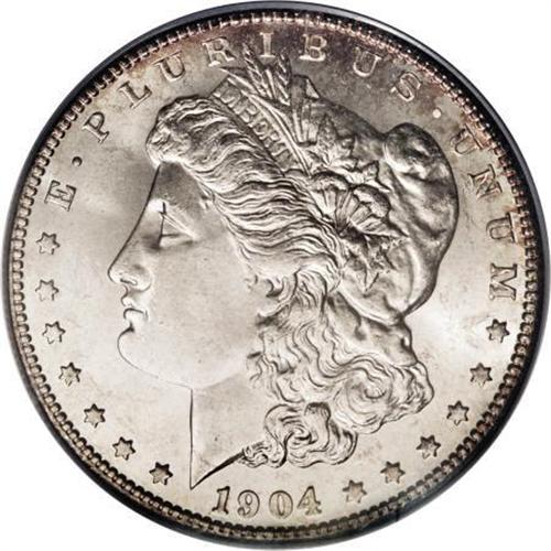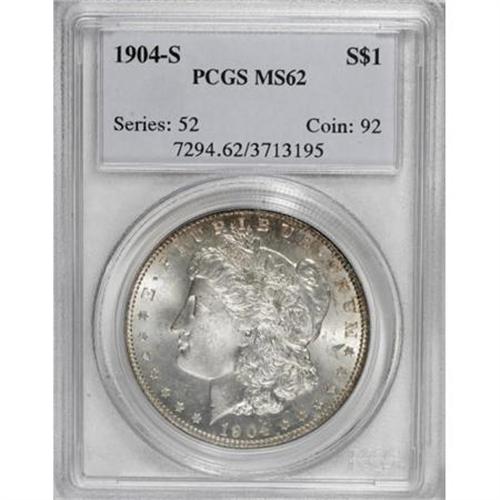 <B>1904-S $1 MS62 PCGS.</B></I> An attractive piece from the final S-mint issue before the denomination's 17-year hiatus. Only a touch of softness is present on the obverse highpoints, and the surfaces offer pleasing detail elsewhere. Strongly lustrous with scattered cloud-gray haze in the fields and a blush of peach at the upper obverse that adds color to the coin.<BR><BR><B>Coin Engraver:</B> George T. Morgan<BR><BR><b>Shipping:</b> Coins & Currency (<a target="_blank" href="http://www.heritageauctions.com/common/shipping.php">view shipping information</a>)