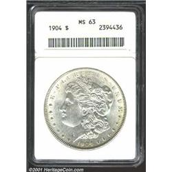 1904 S$1 MS63 ANACS. Lightly toned and nicely struck. The luster is good but lacks intensity. The surfaces are well preserved for the grade. Important notice: We expect to be auctioning lots at the rate of 200-250 per hour. Sometimes eBay Premier live bid software cannot keep up with that pace, so we strongly recommend that you place a realistic proxy bid now as insurance to avoid disappointment. Also please note that all Heritage/CAA lots purchased through eBay Premier carry a 20% Buyer's Premium.