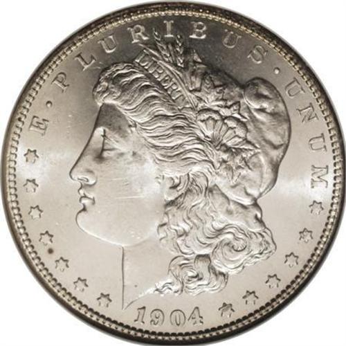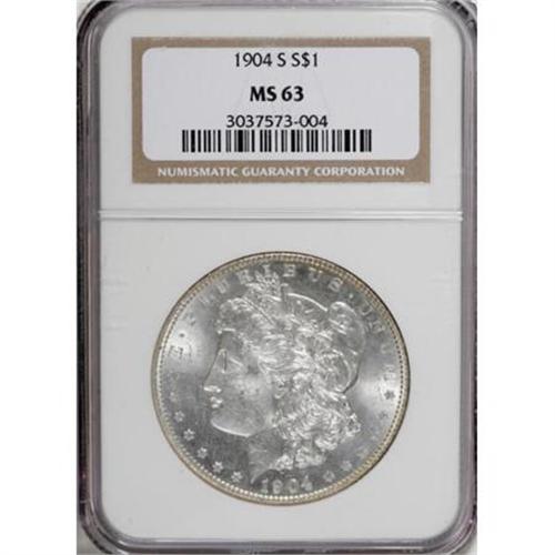 <B>1904-S $1 MS63 NGC.</B></I> The 1904-S dollar is somewhat elusive in Mint State, especially with sharply struck design elements. This Select example is generally well impressed, showing some definition in the hair at Liberty's ear and on the eagle's breast feathers. Lustrous surfaces are essentially untoned, and reveal a few grade-defining marks.<BR><BR><B>Coin Engraver:</B> George T. Morgan<BR><BR><b>Shipping:</b> Coins & Currency (<a target="_blank" href="http://www.heritageauctions.com/common/shipping.php">view shipping information</a>\)