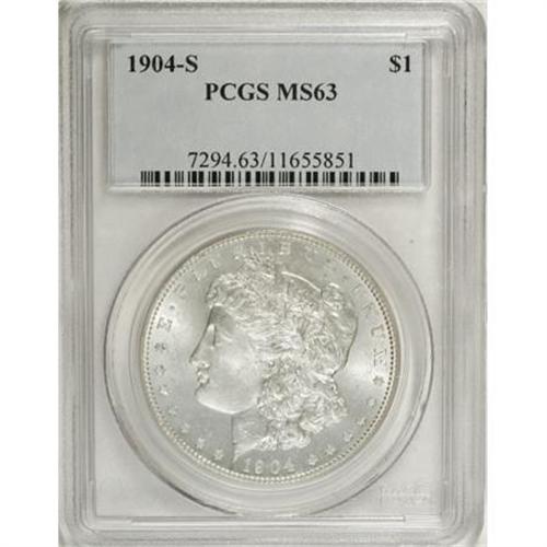 <B>1904-S $1 MS63 PCGS.</B></I> A brilliant example of this scarce, later date, post-1900 Morgan dollar. Well struck with a few minor abrasions on the obverse, the reverse is virtually free from marks. Exceptionally lustrous with a hard, satiny sheen over both obverse and reverse. Generally not located in higher grades.<BR><BR><b>Shipping:</b> Coins & Currency (<a target="_blank" href="http://www.heritageauctions.com/common/shipping.php">view shipping information</a>)